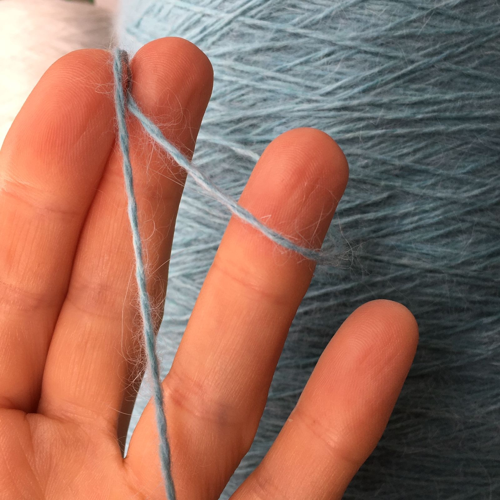 цвет: бирюзово-голубой; образец связан в одну нить на спицах №4.