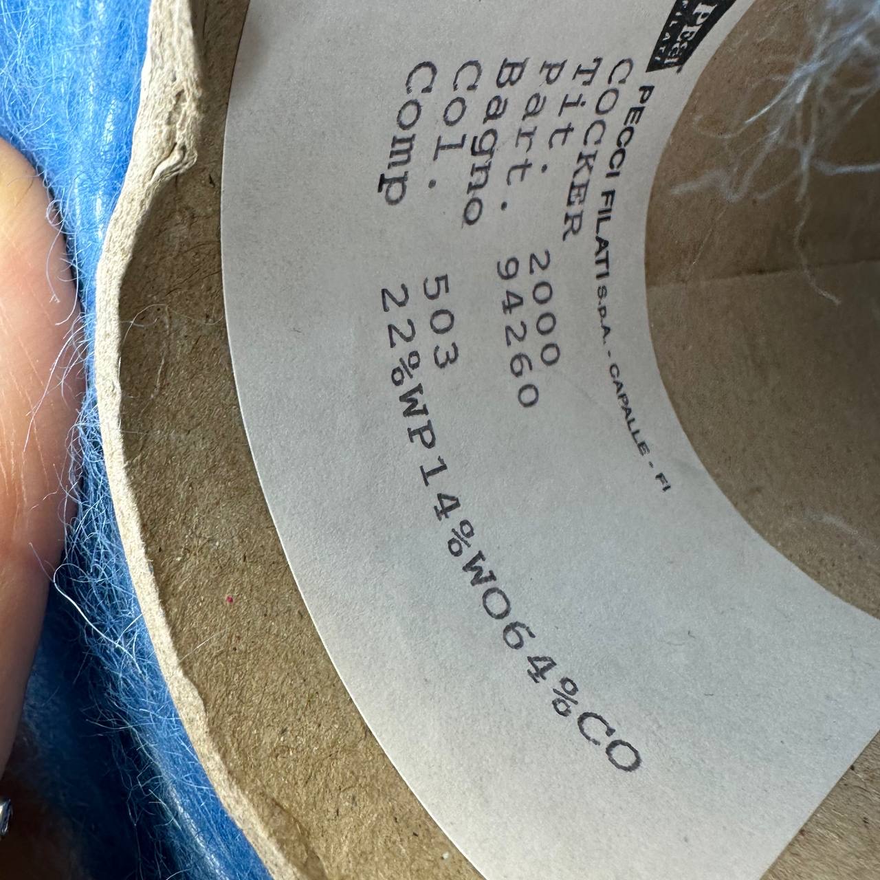 COCKER - Pecci Filati; 22% альпака superfine, 14% меринос 64% хлопок organic; 200м/100гр. col. 503, цвет: голубой пух на белом шнурке