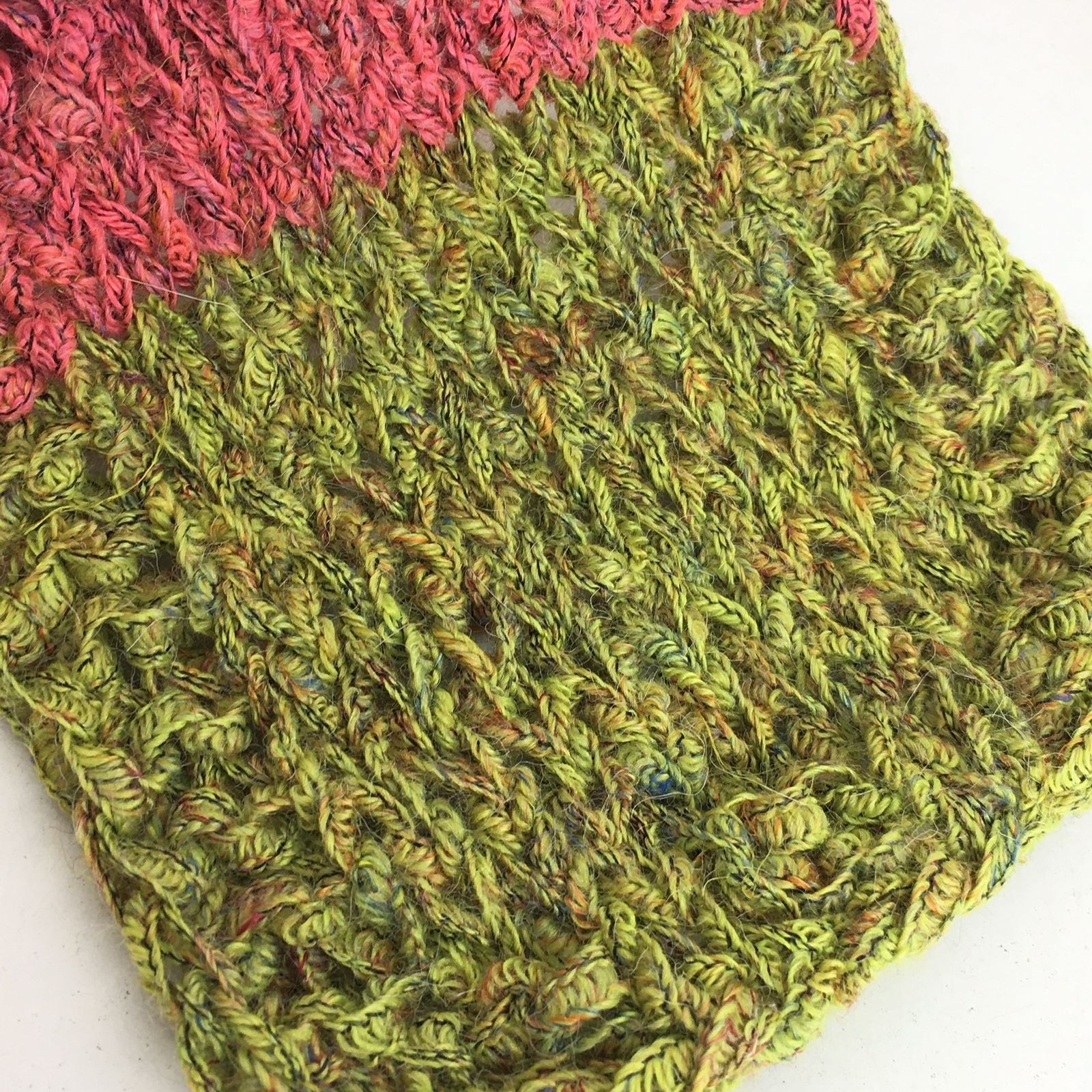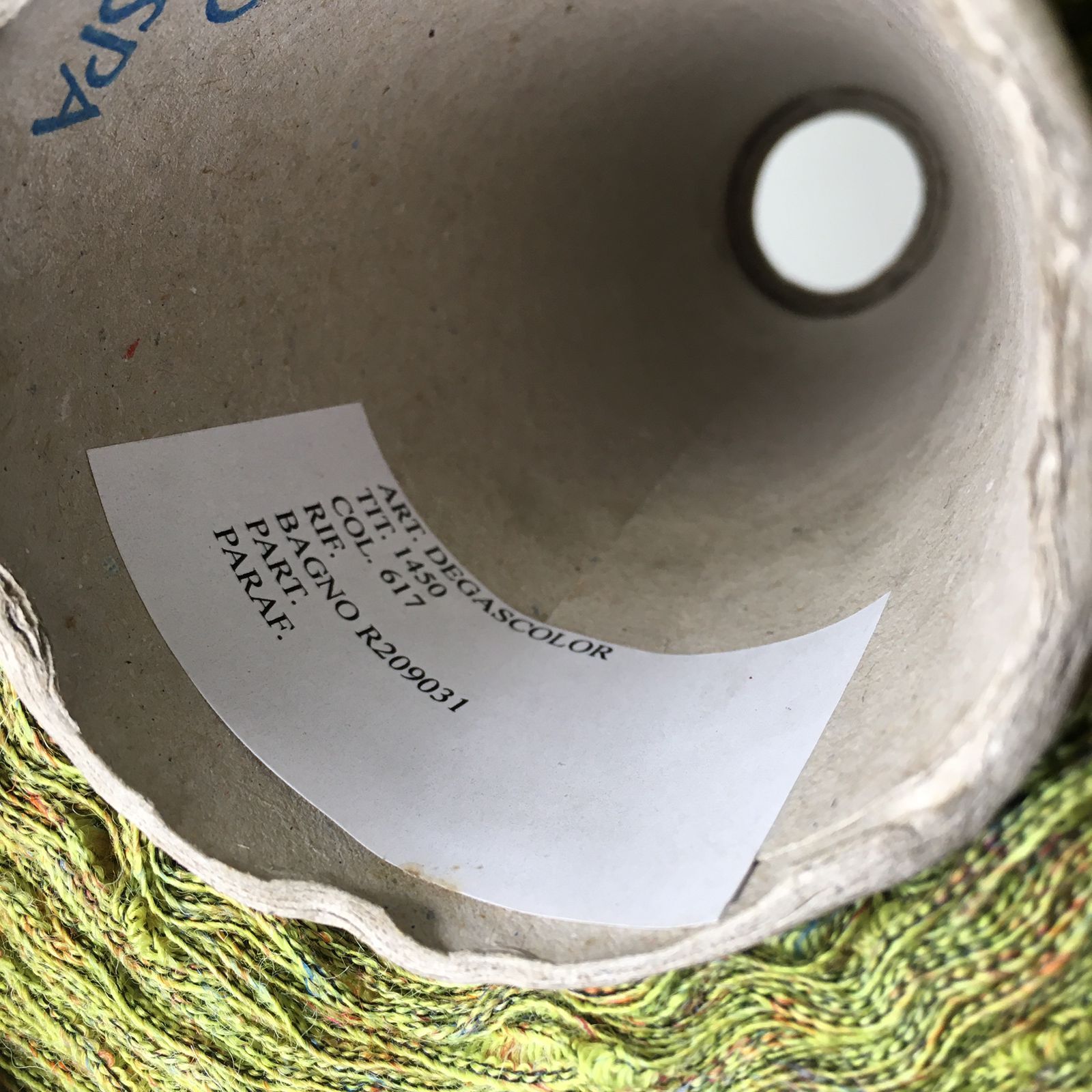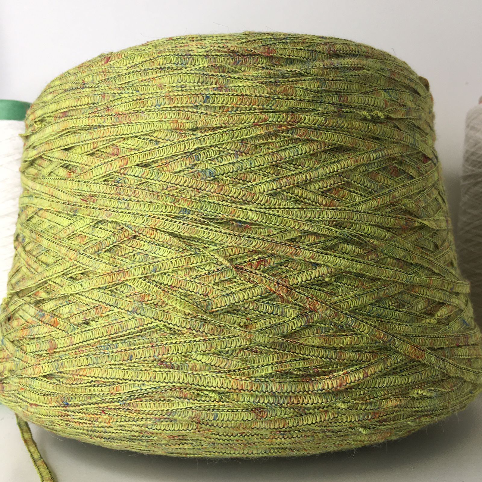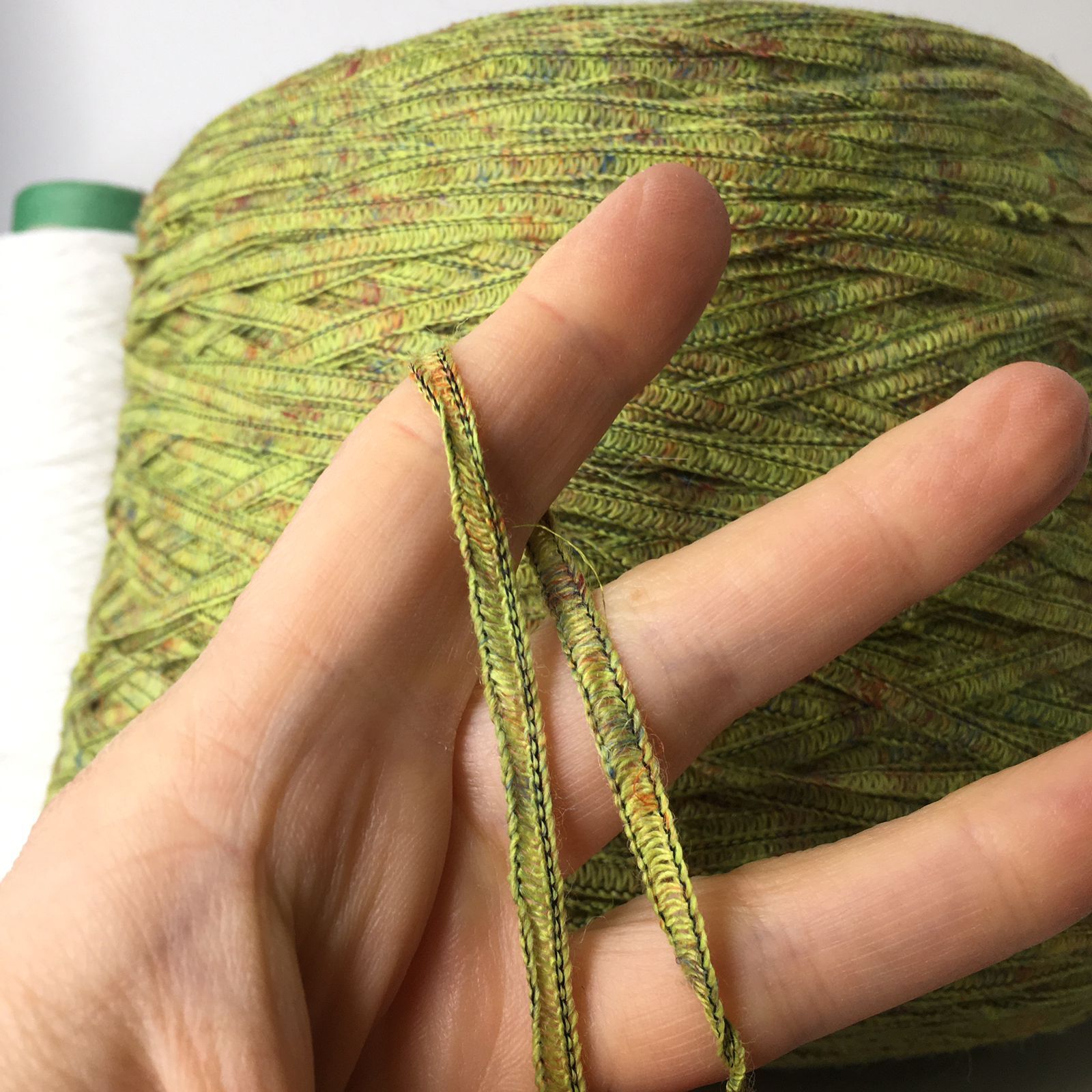 DEGASCOLOR - LANIFICIO dell' OLIVO; 17% лен, 31% меринос, 37% п/а 15% п/с; 145м/100гр; Ленточка. Образец связан в одну нить на спицах №4,5