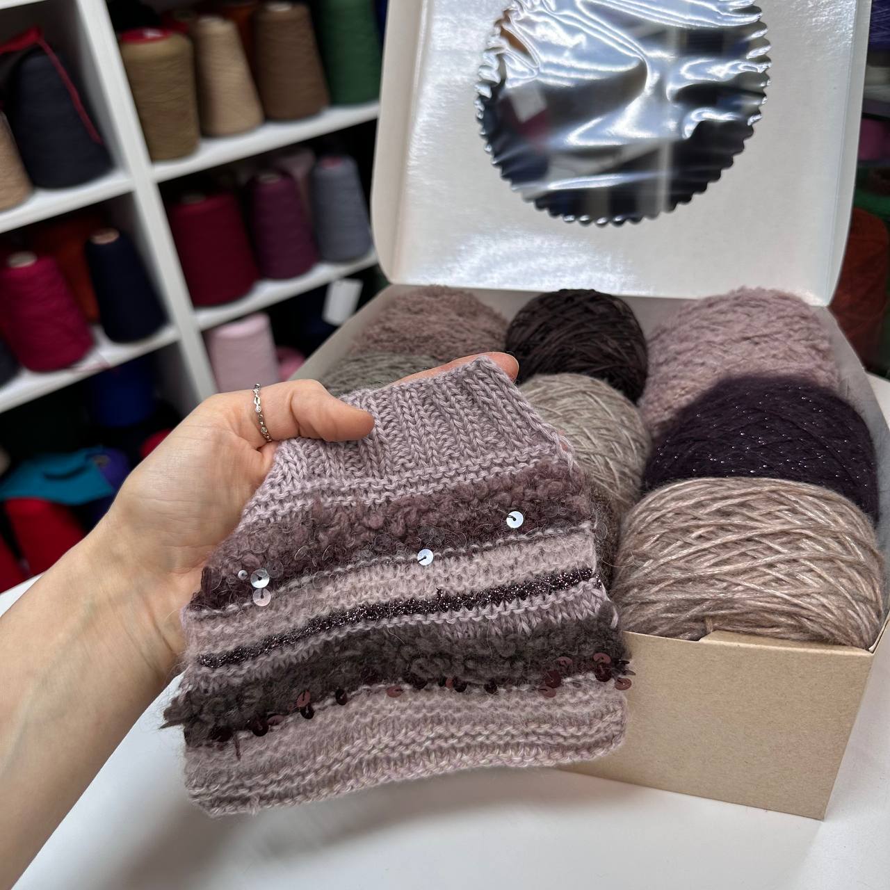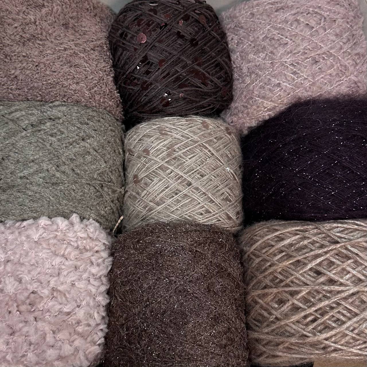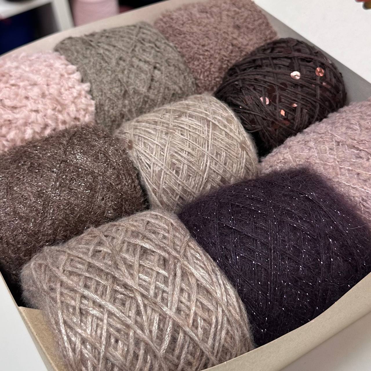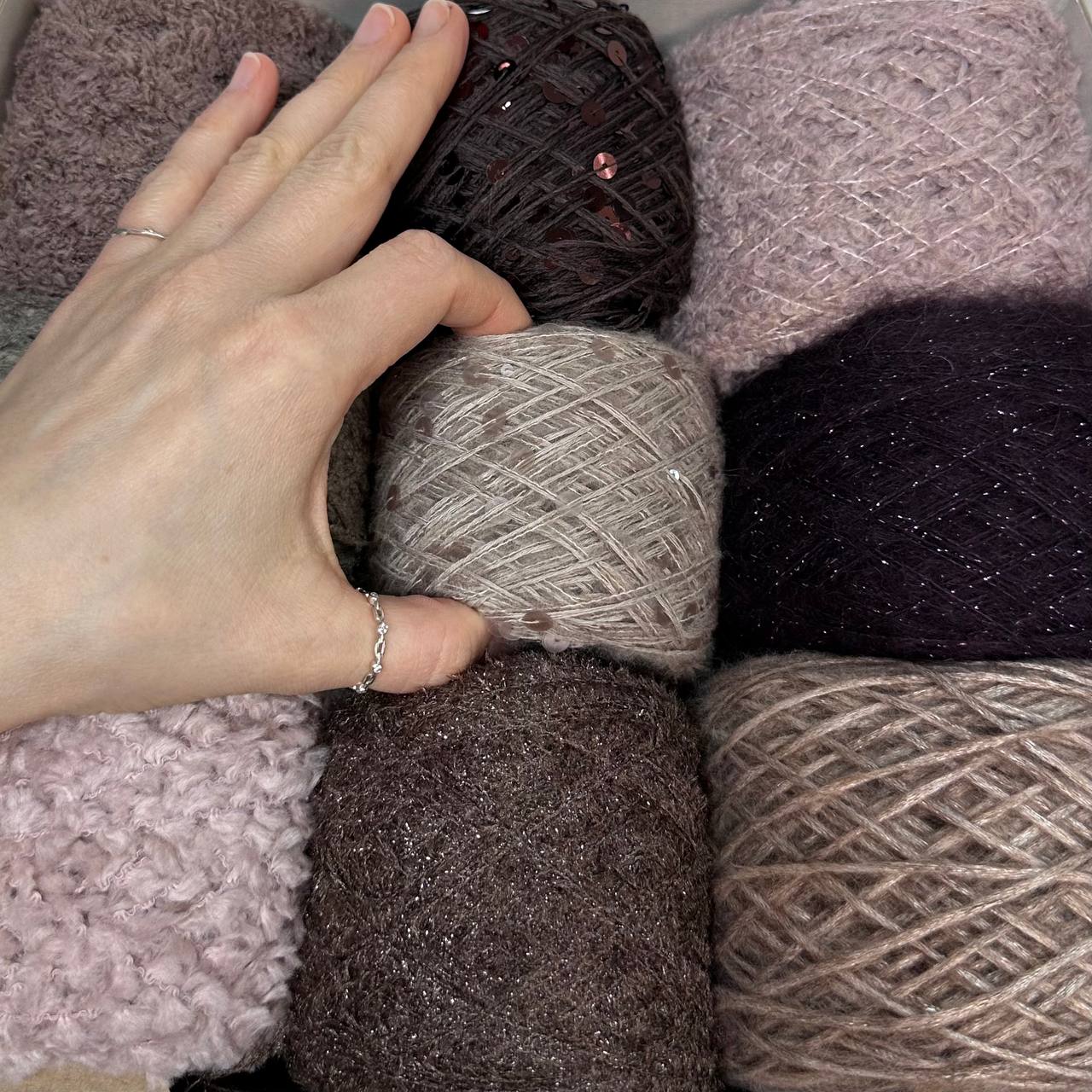 Набор итальянской фантазийной пряжи для джемпера "КАПРИЗ"; Состав: кидмохер, меринос, альпака, хлопок, люрекс, пайетки. Общий вес: 560 гр