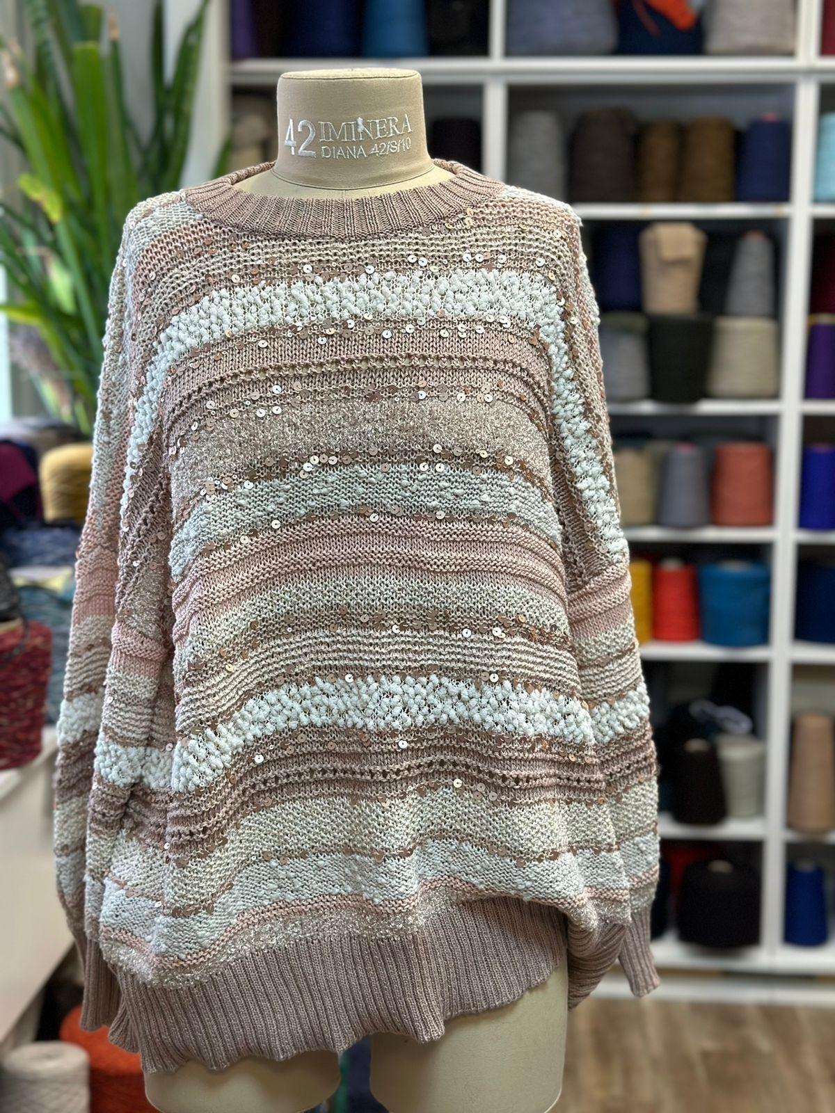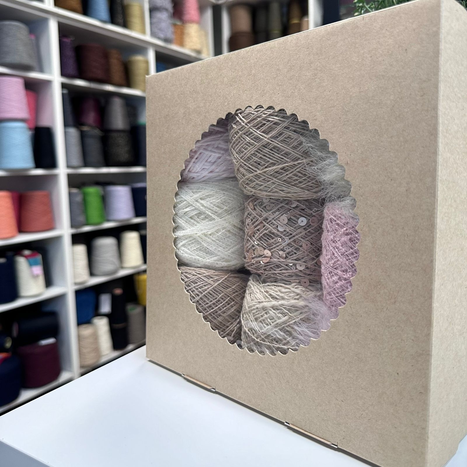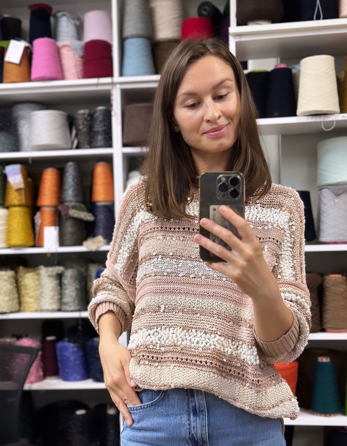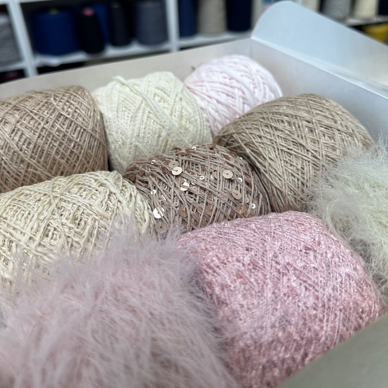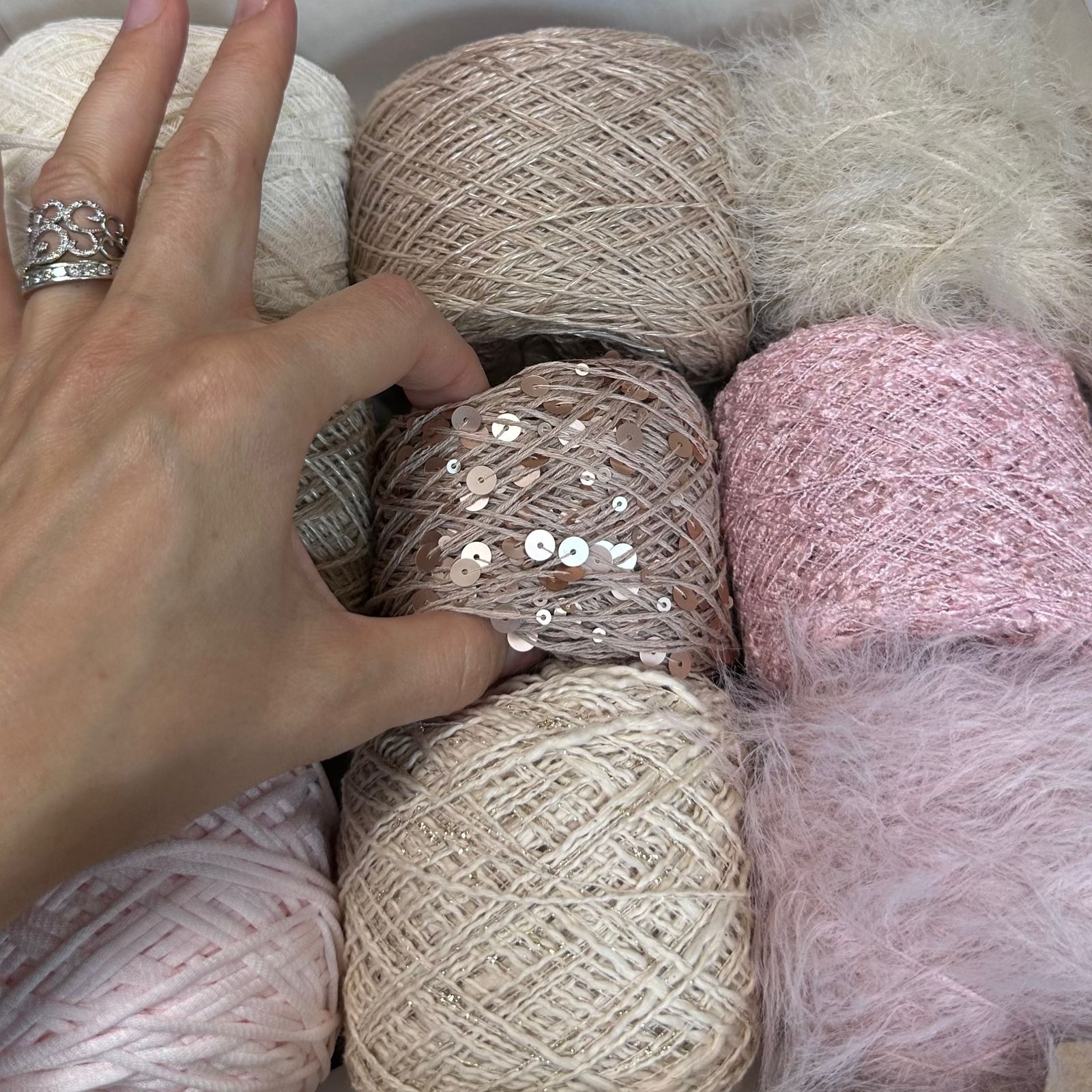 Набор итальянской фантазийной пряжи для футболки, джемпера "Сатиновая Роза"; Состав: «лебяжий пух», сатиновые пайетки 3 и 6 мм, хлопок, фактурная ленточка, деликатный люрекс; Общий вес: 550 гр