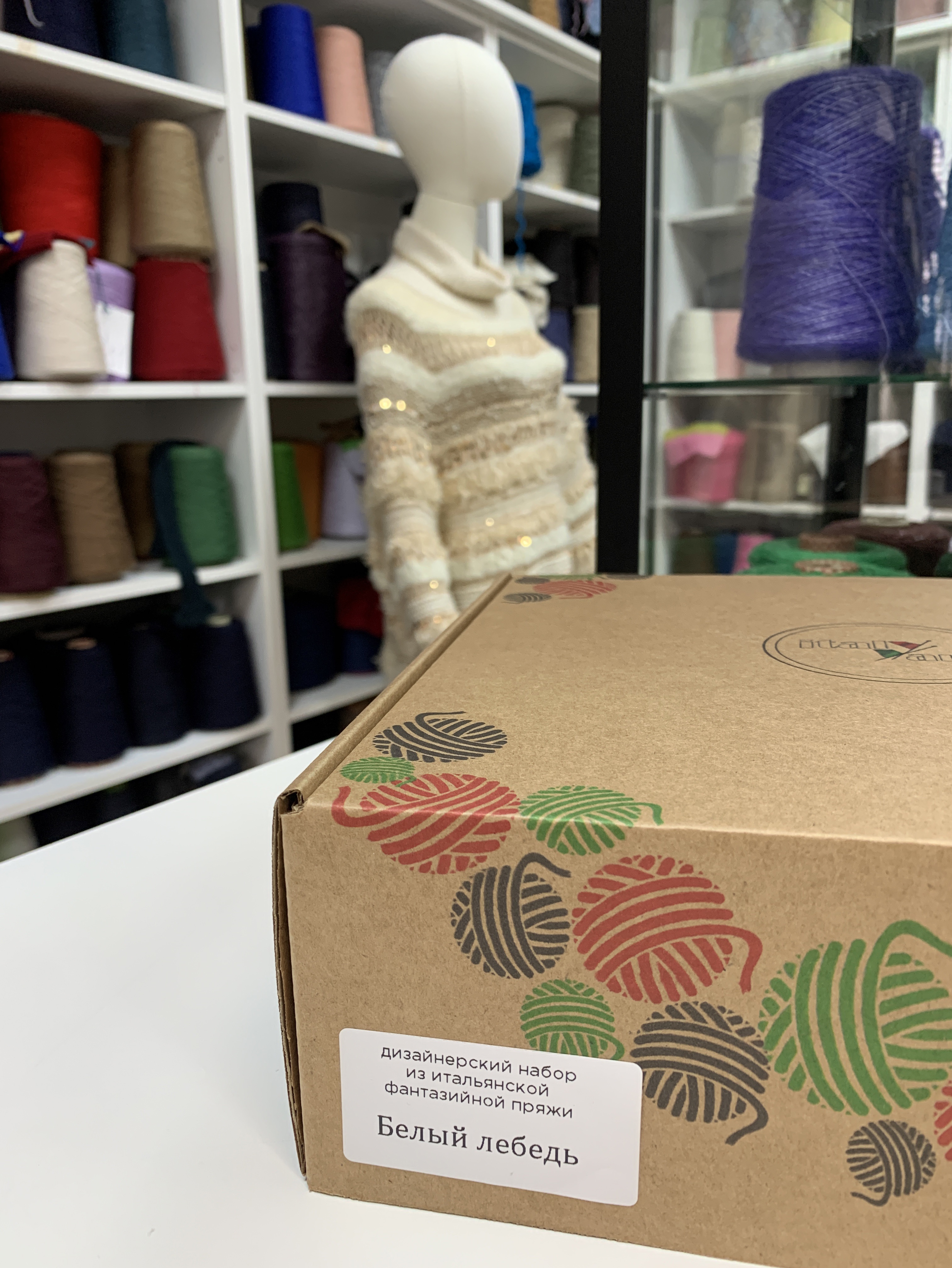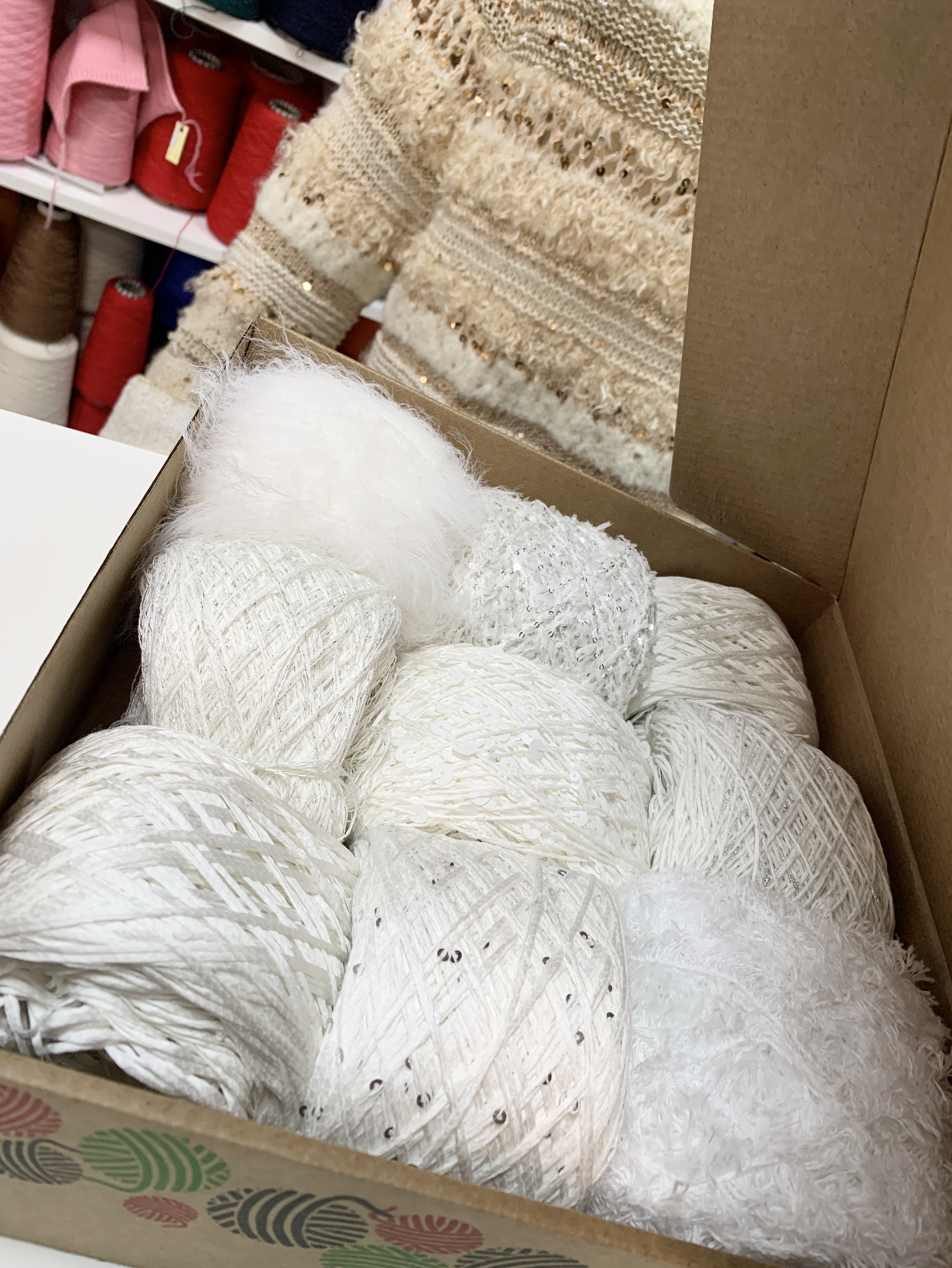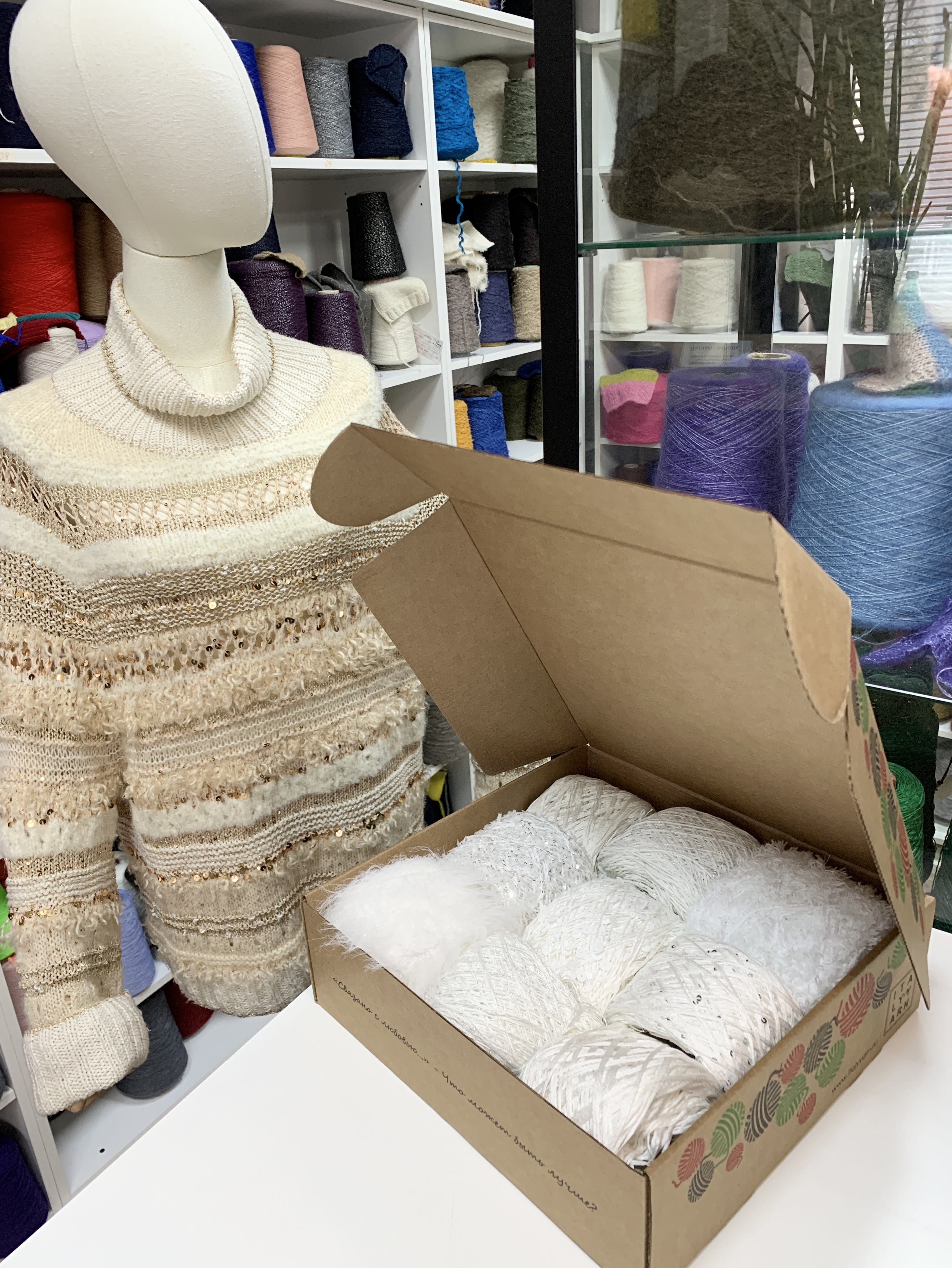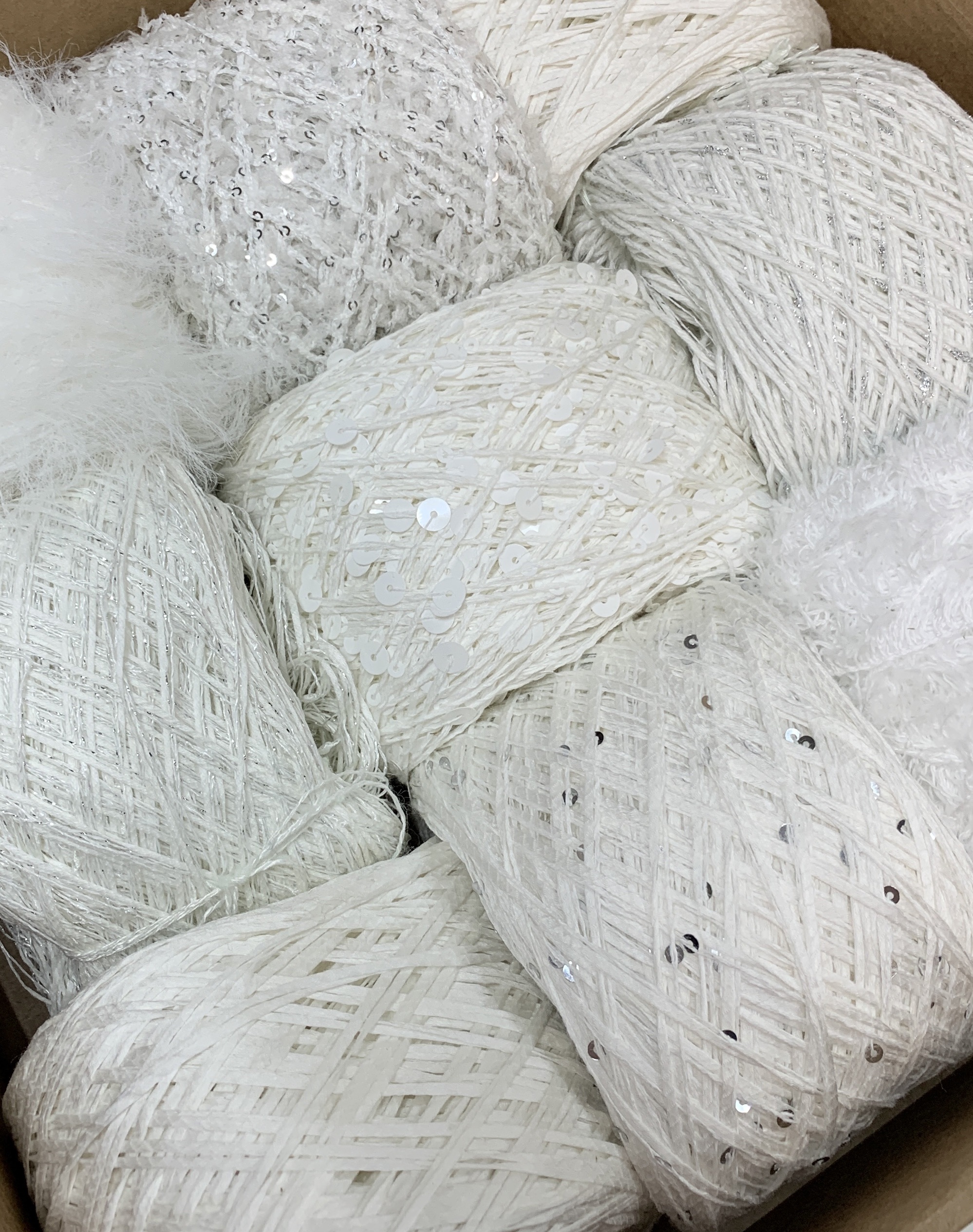 Набор летний итальянской фантазийной пряжи для футболки, джемпера "Белый лебедь"; Состав: хлопок, пайетки, вискоза, люрекс, микрофибра. Общий вес: 500 гр