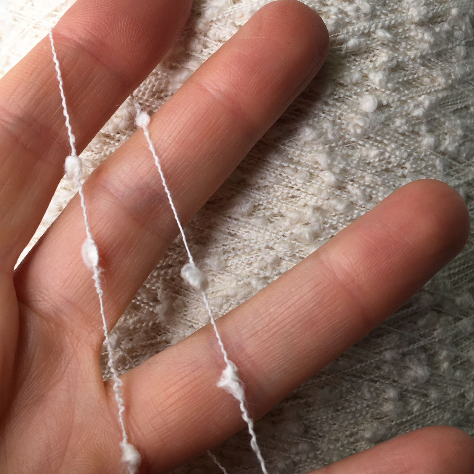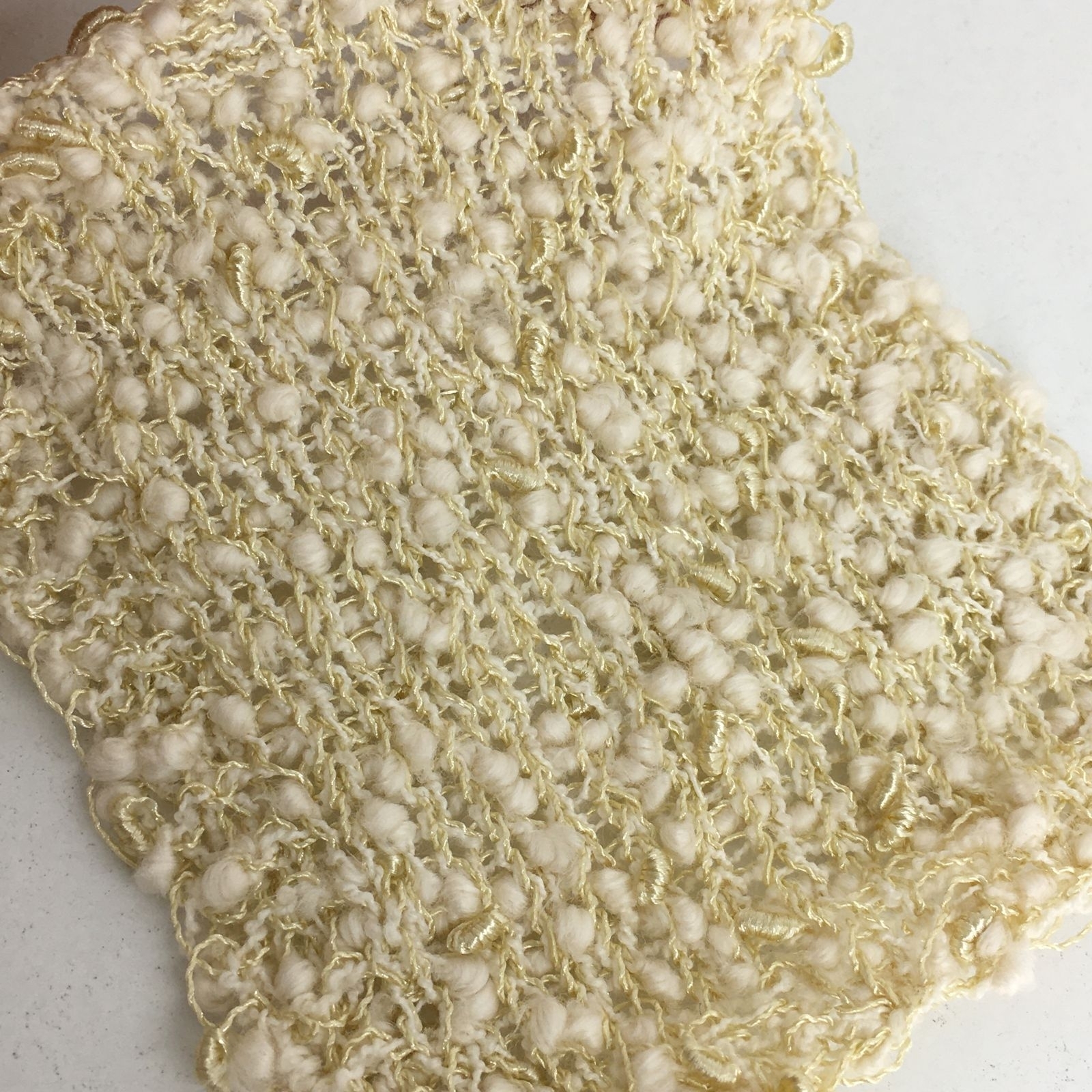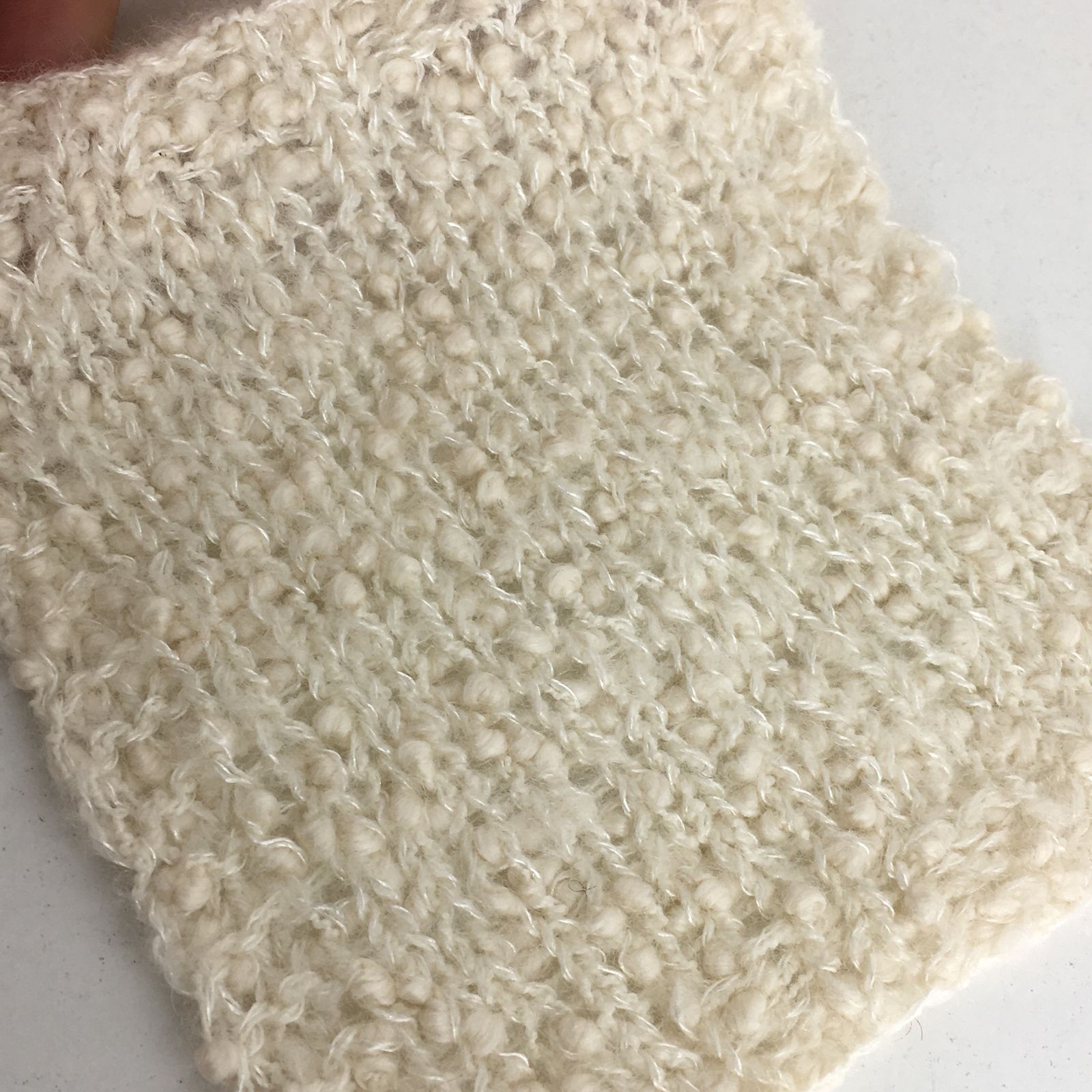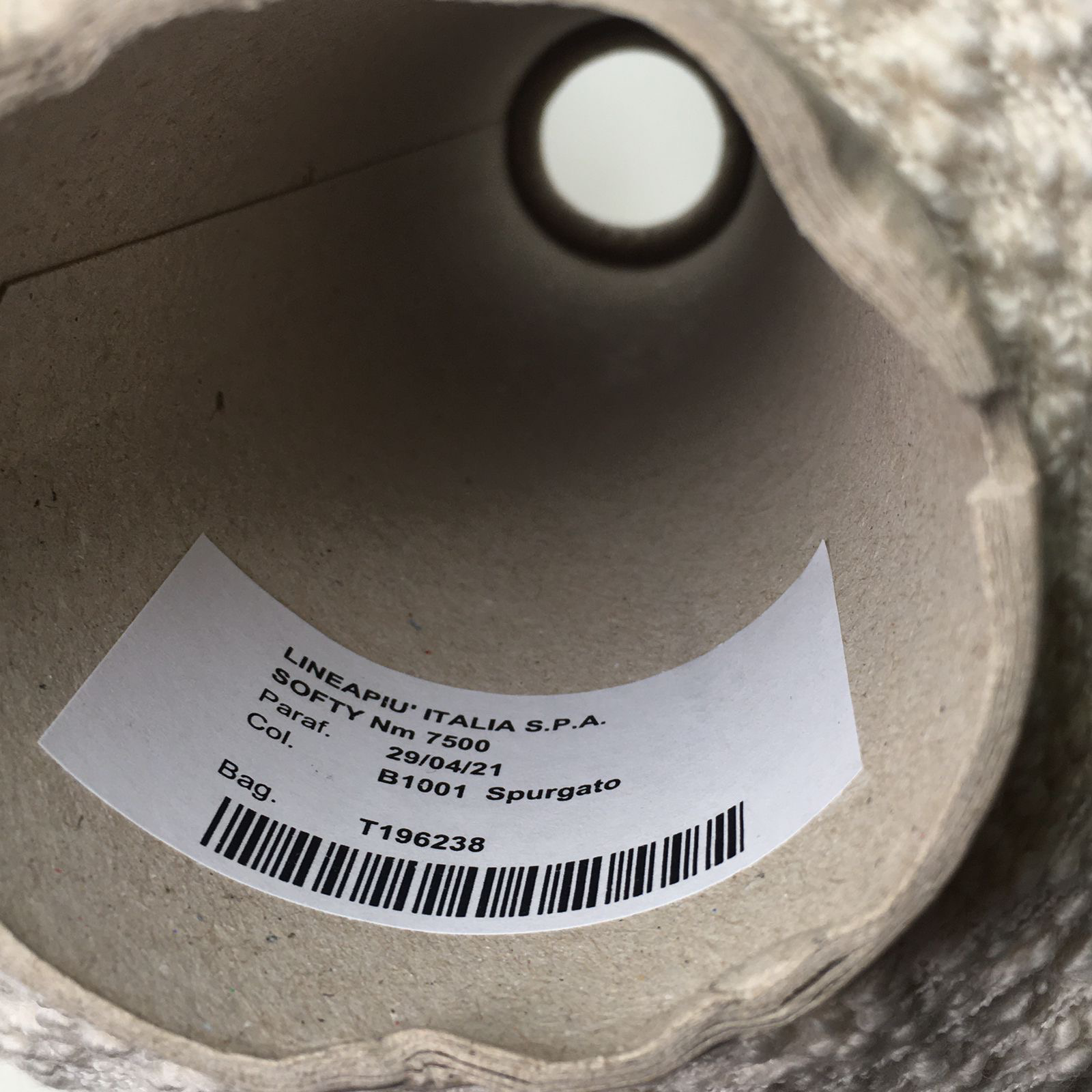 SOFTY - Lineapiu' S.p.A.; 78% хлопок, 21% п/а, 1% эластан; 750м/100гр; col. B1001, цвет: белый, молочный ( несколько желтеет при намокании, - цвет становится ближе к молочному/ топленому молоку). Первый образец из пряжи того же артикула, но другого цвета. Второй и третий образцы связаны дополнительной нитью Softy, второй - на спицах №4, третий - на спицах №3.