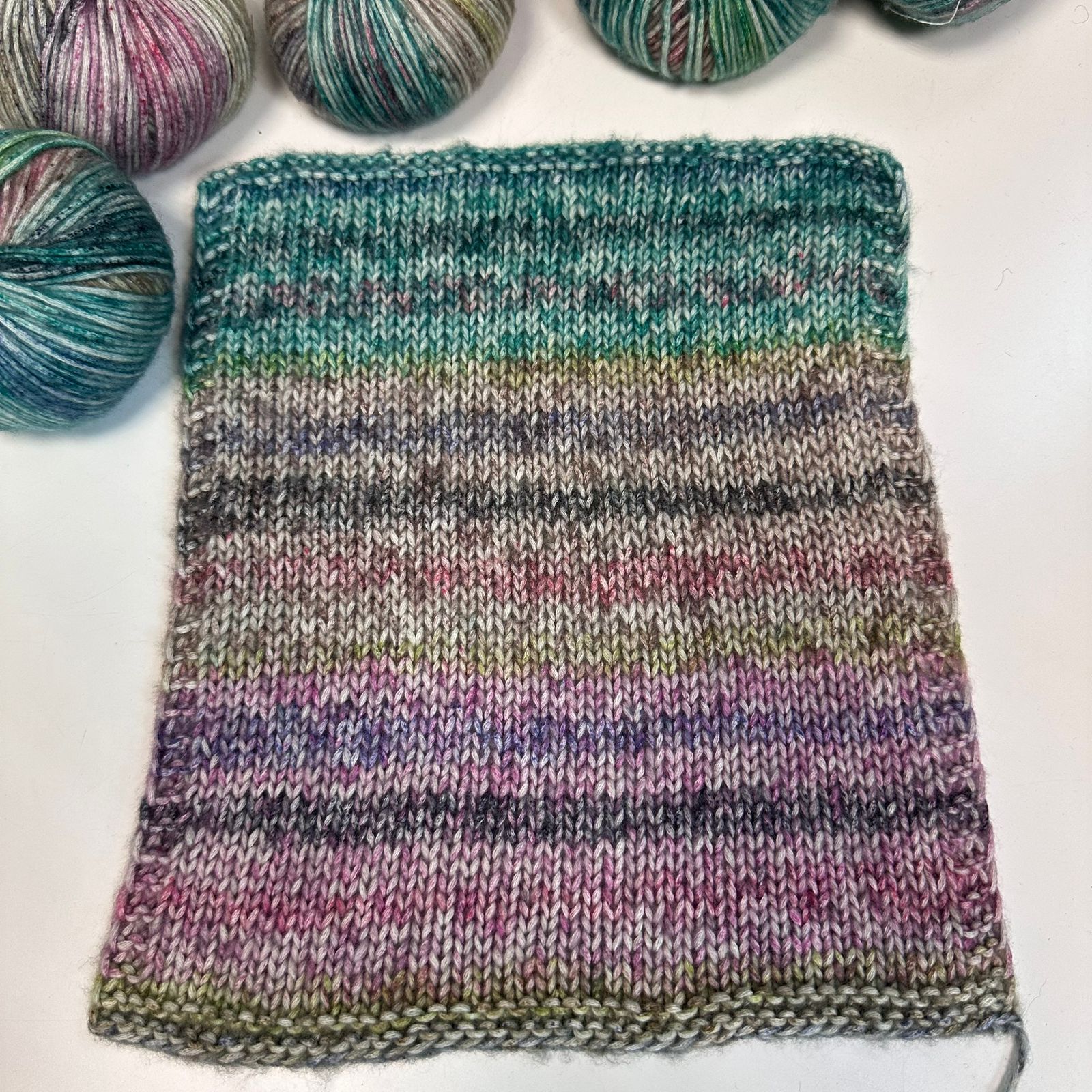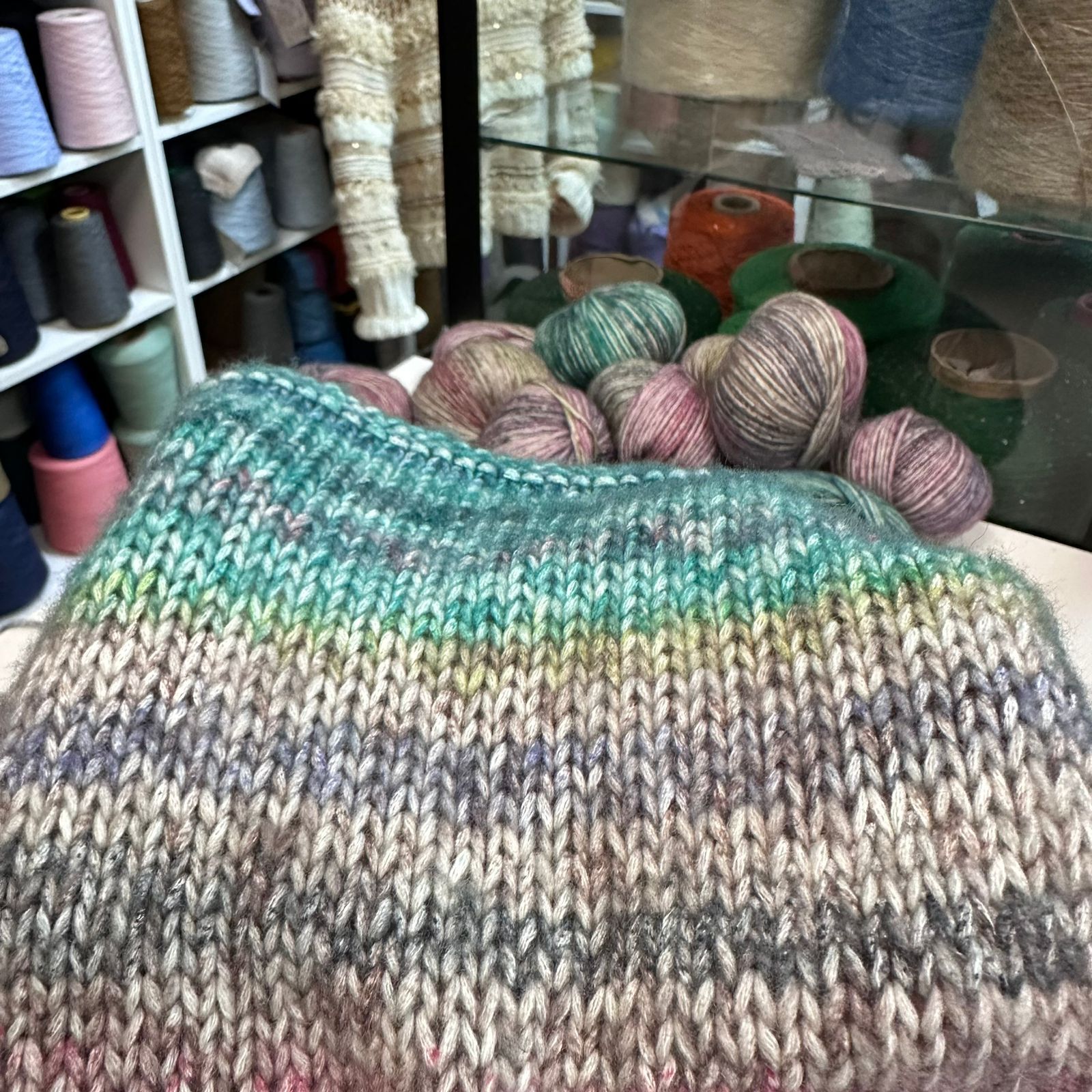 Stok Italy кашемир, хлопок, меринос ~290м/100гр Средний вес примерно 38гр. На фотографиях с тремя моточками представлен один цвет, - его разные фрагменты секций. Образцы (другой артикул(цвет)) связаны на спицах №4