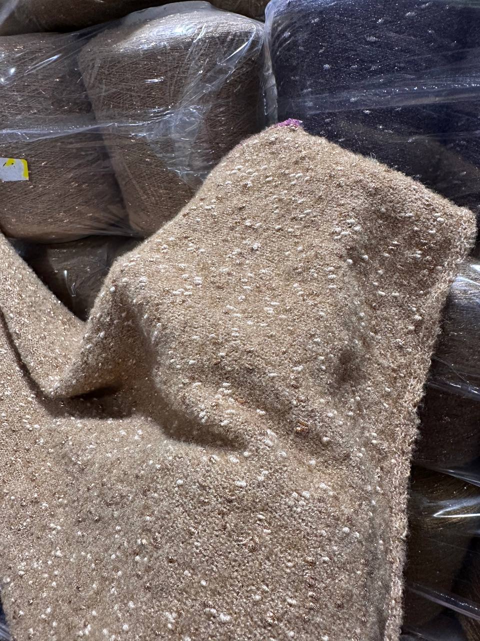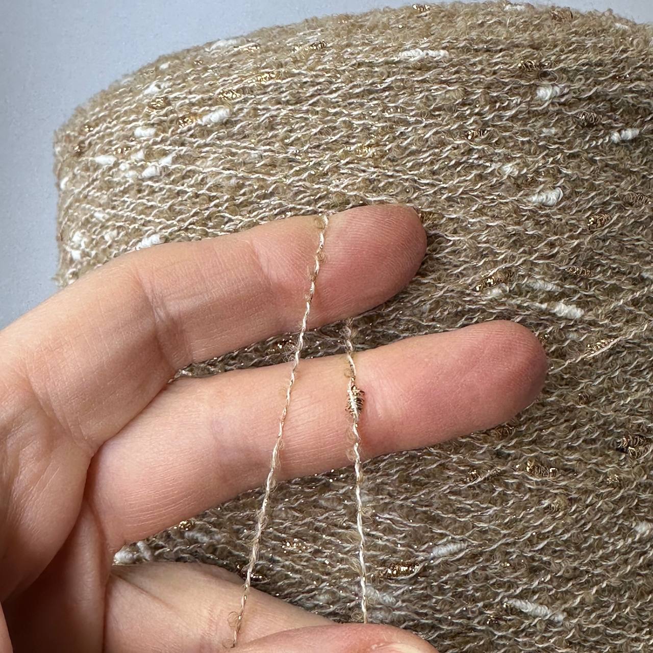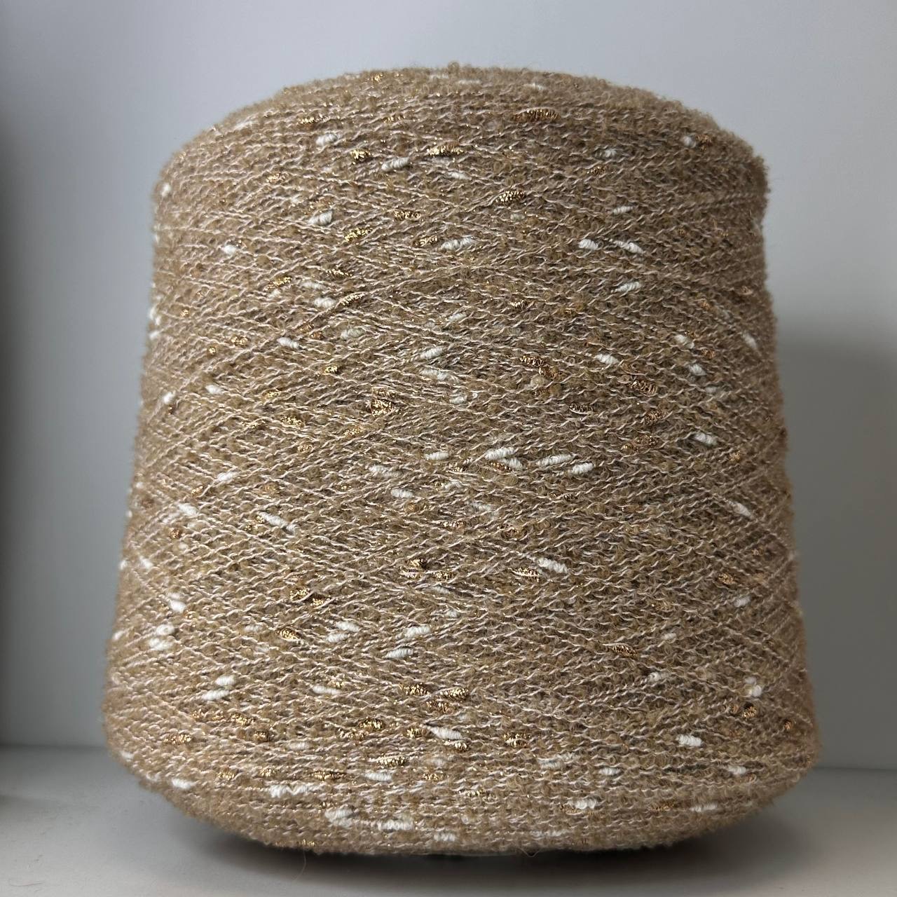 VOICE - Ri.Go; 45% альпака, 19% меринос, 17% п/а, 19% люрекс; 650м/100гр; Букле мелкое, col. 23136, цвет: бежевый с белыми и золотистыми шишками