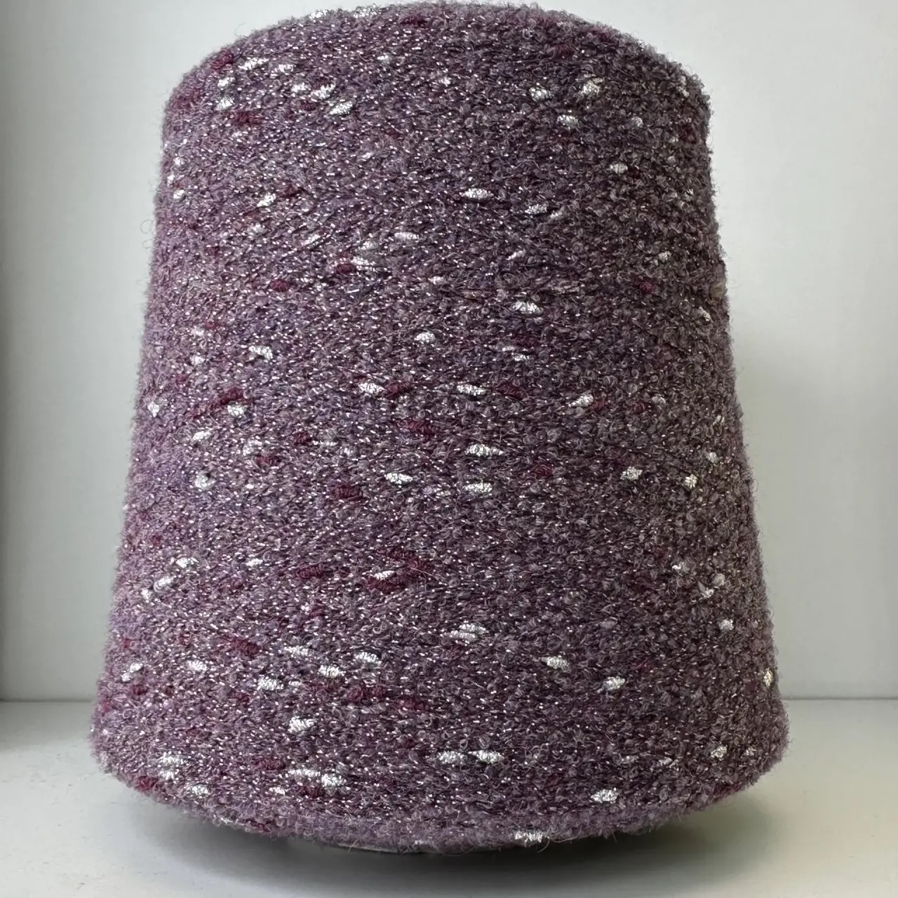 VOICE - Ri.Go; 45% альпака, 19% меринос, 17% п/а, 19% люрекс; 650м/100гр; Букле мелкое, col. 1659, цвет: пыльно-фиолетовый с серебристыми и инжировыми шишками;